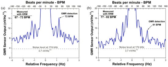 Furthermore, experiments were performed in order to study the suitability of the device to measure the biomagnetic signals originated in the heart. The measurement was performed with the sensor placed close to the heart, distancing 1 cm to the subject’s chest, in a completely unshielded environment, as Figure 6 depicts. Figure 7a displays the heart-rate of a subject at rest modulated at 174 kHz, the measurement was obtained after 5 min averaging, and repeated several times, to confirm reproducibility. In Figure 7b, the same measurement is repeated after a short walk to increase heart-rate. During the measurement, the heart rate was also monitored with a standard heart-rate monitor (HRM), used as a reference. The heart rate obtained with Picosense’s device is in accordance with the value obtained by the standard HRM, validating our measurement.