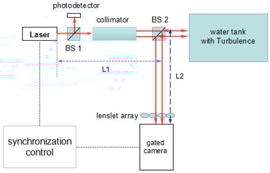 where is the travel time of the laser pulse, and r is the speed of light in the working condition. In our setup, we set the distance from the laser to the second prism, BS2, as equal to the distance from the BS2 prism to the range-gated camera (L1 = L2), as shown in Figure 1, in order to simplify the calculation. The front part of each laser pulse will carry the wavefront information of the underwater turbulence from different distances.