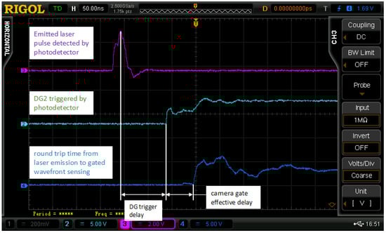 The actual delay time is calculated based on the principle of synchronization control, which was mentioned above. Figure 7 shows the three signals on an oscilloscope, where the time difference between each other i.e., the external trigger delay of the delay generator, and the effective delay of the camera, can be determined. The output from the photodetector is the emitted laser pulses (in purple); the output from the delay generator (DG) 2 is triggered by the photodetector (in green); and the camera gate output (in blue) is used as a reference to indicate the round trip time from laser emission to gated wavefront sensing. In our experiments, the laser pulse frequency was set to 30 Hz. To configure an accurate gate-opening time, we measured 50 times to calculate the standard deviation of the actual DG, and camera delay. From our calibration, a DG external trigger time delay is 116.2 ns, and the effective time gate delay is 11.4 ns.