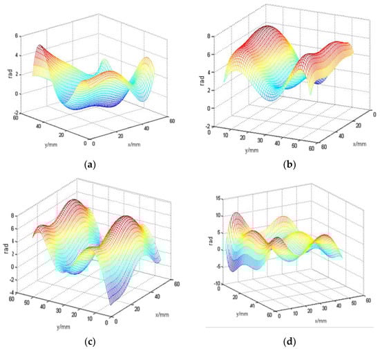 The results of wavefront reconstruction at the same distance with different water flow rates: (a) 10 L/min; (b) 20 L/min; (c) 30 L/min; and (d) 40 L/min.