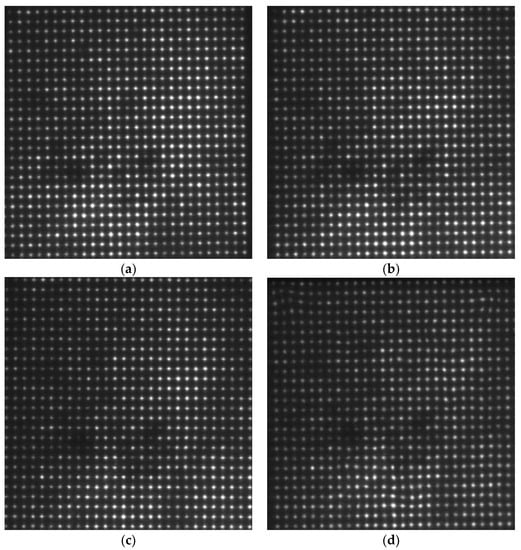 Focal spot images acquired from different distances. (a) Focal spot image from 1 m; (b) focal spot image from 2 m; (c) focal spot image from 3 m; (d) focal spot image from 4 m.