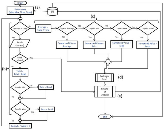 The operation of the algorithm in the node sensor basically makes a query to a database, searching the collection period, the type of summarization that was defined in the application (average, minimum, maximum, total, etc.), and the respective values, as observed in Figure 3a. After that, the data is summarized (Figure 3b), obtaining the minimum, maximum, and total values of the readings performed during the time according to the database. When the number of readings is finalized, the type of summarization defined in the database is verified (media, minimum, maximum, total) by recording the value according to the summarization defined in the application (Figure 3c). Next, the Bollinger bands (d) are analyzed to decide whether to record the data or not (by sending it to the database). If the return is positive, the value is recorded in the database, otherwise the value is discarded (Figure 3e). This algorithm demonstrates the implementation of summarization in the node through the method of aggregation of distributed data, using minimum, maximum, total, and average values to accomplish the summarization of the data.