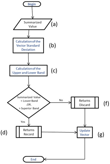 At each summarization cycle, the algorithm sends the summarized value for Bollinger Band checking (Figure 4a), where the moving average is calculated (Figure 4b) and its upper and lower bands defined as Bollinger bands (Figure 4c), are identified. If the summarized value is within the bands, the main function returns the command for not recording the value in the database (Figure 4f). Otherwise, the value extrapolates the bands and the command sent is for the value to be recorded (Figure 4d). After the calculation is performed, the vector is updated (Figure 4g), discarding the oldest value, rearranging the index of the vector according to the entries, and the new value is inserted into the vector, working as a queue.