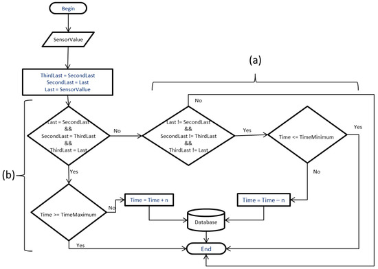 Exemplified in the flowchart of Figure 5, the values recorded by the nodes are analyzed, and if the values do not change, the data send times are increased as demonstrated in Figure 5b. If these values change from one reading to the other, the time is maintained, and if the values change within three different readings, the data send time is reduced, as demonstrated in Figure 5a.