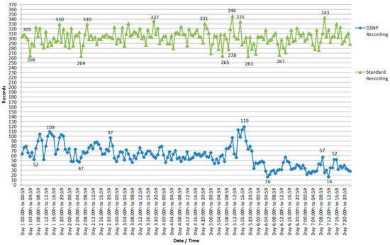As a first observation, the large difference presented in the number of registers needed to obtain the luminosity stands out (Figure 8). Although the standard recording averaged 358 recordings per hour sequentially over a seven-day period, the DSNP approach averaged only 8 recordings per hour in the same period. In percentage terms, this corresponds to a reduction in the number of records of 97.77%. In total, the number of records stored by each sensor with standard recordings was 60,148 standard recordings and 1327 records recorded in summary form, using DSNP.