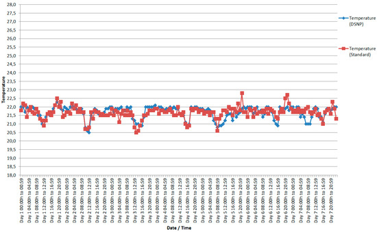 In order to assess the quality of results of our DSNP approach, Figure 7 presents the temperature measurements for the considered week. As can be observed, the values are very similar, with a tenth of a degree difference in relation to the sensors for the nodes that sent the records sequentially. The average temperatures recorded in the standard form, sequentially identified in Figure 7 by Temperature (Standard), were very close to the average temperatures recorded by the nodes configured with the algorithms proposed in this work, identified in the same figure as Temperature (DSNP).