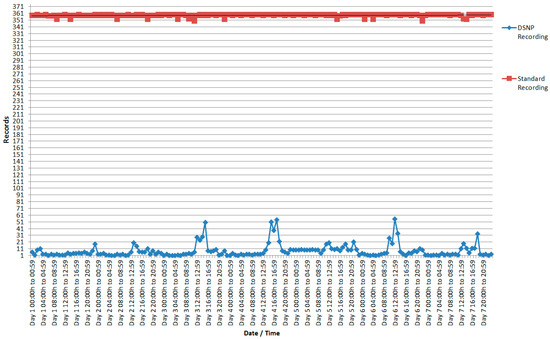 We first analyze the results given by the temperature sensors. Figure 6 shows the amount of records during a week for the two methods compared in this work. As can be seen, 50,808 standard recordings were performed sequentially, averaging 302 recordings per hour. The node executing with the DSNP approach performed during the same period of seven days made 9902 recordings, for an average of 59 recordings per hour. Compared to the standard recording, DSNP provided a decrease in the number of records made by 80.5%.