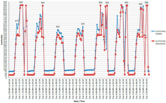 Regarding the data quality, it is observed in Figure 9 that the values were very close between the readings of standard form and using the DSNP approach. Note that the range of values measured by this type of sensor is large, where the value 0 (zero) is very close to the total darkness and the value of 1023 is the maximum luminosity collected by the sensor.