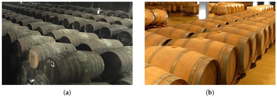 Figure 2. Fino wine cask vs. red wine cask. (a) Fino wine cask; (b) red wine cask.