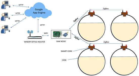 The communication architecture (see Figure 4) has been structured in two levels. In the lowest level, there is a powerful node acting like a gateway (sink node) that collects all the information generated by the smart corks (end-nodes) through the ZigBee protocol working in the 2.4 GHz band. In a large winery (which is not our case), where distances are greater, adapting this communication level so that all the casks are able to communicate with the gateway may be necessary. The ZigBee protocol allows multihop routing, which can be used in order to extend the wireless range of the network. Finally, in the highest level, the gateway is connected through WiFi to a WiFi router in the winery’s office, and the information received is sent from smart corks to the cloud using HTTP.