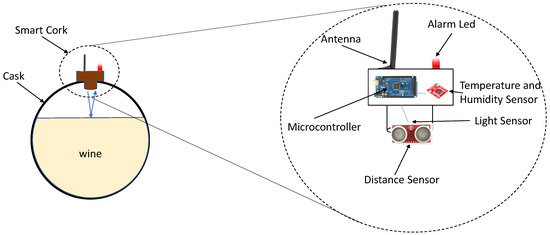 Figure 6 summarizes the hardware architecture that has been installed in the smart cork. The sensors chosen provide information about important parameters that are essential during the wine elaboration process and whose alteration has a negative effect on the quality of the wine [26]. Table 1 depicts the models and consumption of the different components that have been chosen for the prototype system. The table also shows an approximate cost of the cork prototype components, resulting in a total of €166 per cork. Note that the price is for the prototype and the cost of the wooden enclosure has not been included. A production-integrated solution would significantly reduce the costs. Another communication module would necessarily have to be placed in the sink node. The sink node could be deployed on many more powerful IoT devices such as a Raspberry Pi (54€ approx. price) or a PC.