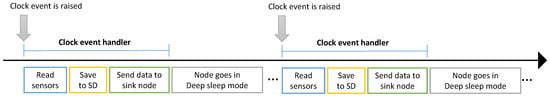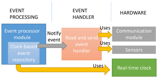Figure 7 shows a simple diagram of the firmware architecture. The firmware installed in the Arduino is a simple event-based middleware that carries out actions based on different events that can be defined by the developer. Events are raised by the developer or can be automatically raised by the event-processor module. This module uses a real-time clock module to raise time-programmed alarms. In the prototype program, a total of 144 clock-based events per day have been programmed (one every 10 min). After the event has been triggered by the event-processor module, the firmware carries out the following steps: