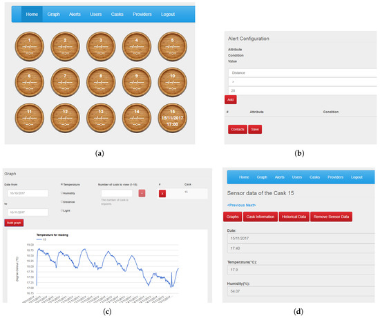 Once a registered user has accessed the system using his/her credentials, the web UI displays an overview of the casks, as shown in Figure 9a. By selecting a certain cask, a form, as shown in Figure 9d, will be displayed where the latest information about that cask can be seen. Furthermore, admin users can also generate graphs of the physical phenomena measured, visualize the cask information, see the historical data, or even remove it. Winery users can only visualize information about the casks and generate graphs. Graphs can also be generated with the information from various casks with the Graphs tab, as shown in Figure 9c. This functionality enables the evolution of different casks to be compared. However, one of the main desired functionalities of the system is the anomaly detection. Knowing about a cask anomaly as soon as possible can reduce its effects. Alerts can be configured though rules in the Alerts tab as shown in Figure 9b. In this case, it is configured to generate an alert when the ullage is greater than 20 cm, i.e., a possible cask leak. Alerts can be associated with contacts, who will receive an e-mail with each alert generated in the system. With the rest of the tabs, admin users can manage the registered users and providers, and the information related to the casks.