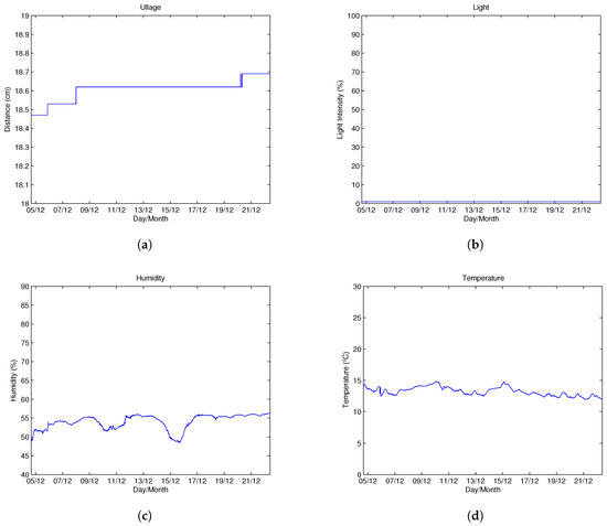 Wine cellar sensor readings. (a) Ullage (cm). (b) Light intensity (%). (c) Humidity (%). (d) Room temperature (C).