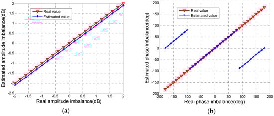 Figure 4a, the distance between the estimated line and the truth line is about 0.1 dB, which means that the selected area is very satisfied with Equation (9). That is, the estimation error of amplitude imbalance really can be controlled within 0.3 dB by selecting forest area. In