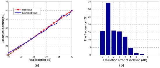 Figure 5a. It suggests that, though the isolation changes from 15 dB to 40 dB, the difference between the estimated isolation and the real value keeps excellently within 1 dB, which proves the correctness and feasibility of the proposed method in