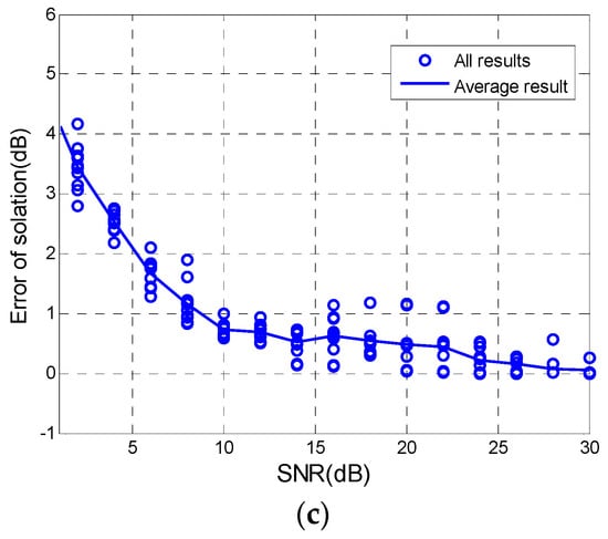 Figure 6c displays that the relative error of isolation is greater as the SNR decreasing, but the error is less than 1 dB when the SNR is more than 10 dB. Combining results of