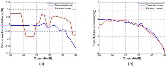Figure 6a, the variation of relative error in terms of SNR is obvious. Moreover, the tendencies of transmit channel and receive channel are coincident. When the SNR is smaller than 10 dB, amplitude imbalances of transmit channel and receive channel deviate the noise-free estimate values over 0.05 dB and 0.1 dB. In