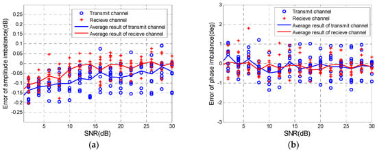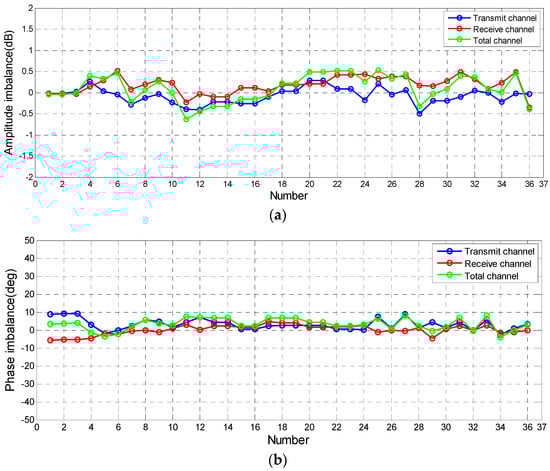 In this section, only CIs are considered. According to Equation (1), the amplitude imbalance of transmit channel (dB) and the amplitude imbalance of receive channel (dB) can be solved as follows: