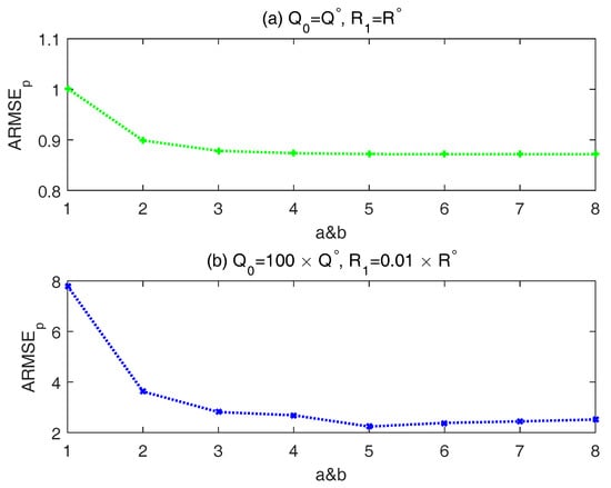 As shown in Figure 1a, the improvement of estimation accuracy diminishes and seems to be trivial after . In this situation, the prior noise covariance is close to the actual one. Thus, the weighting factor should be as small as possible and then a large a implies that the will be set to its lower limit with a very high probability. From Figure 1b, the decreases first and then rising a little. In this situation, a moderate tuning parameter is necessary, as too large or too small tuning parameter may have negative influences on the covariance-matching. The principle of selecting is the same with that of . Therefore, in the following simulation experiments, a and b are chosen as 5.