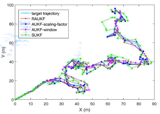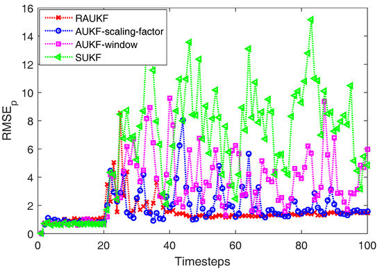 More concretely, as shown in Table 4, the averaged results of the four different algorithms before timestep 20 are almost the same, which means that all of them could deal with the normal situation well. Then, the actual process noise of system changes at the timestep 20, the averaged results of the four different algorithms begin to be different. There is no doubt that SUKF algorithm performs the worst among the four algorithms after timestep 20 as the mismatch between its prior noise covariance and the actual one. The averaged of the proposed RAUKF after timestep 20 is the lowest compared with that of AUKF-window method and AUKF-scaling-factor method, which shows the superiority of RAUKF in dealing with the nonlinear estimation in dynamic noise environment. In detail, the convergence speed of of RAUKF is the fastest among the three different adaptive algorithms (about 10 sample steps).