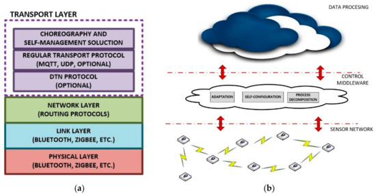 As a consequence, in our scenario, all nodes must implement a network protocol proving addressing to the entire network. No special characteristics are required from this protocol, except a broadcast and/or anycast solution [37] must be supported. If needed, a Delay-Tolerant Protocol [38] could be also included (see Figure 2a).
