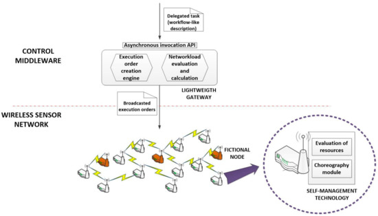 The proposed technology is composed of two different algorithms. The first one is implemented in the control middleware, where a lightweight gateway is included in order to avoid the congestion of the WSN (guarantying the stability of the choreography solution). The second one is implemented in all nodes of the WSN, so they can self-manage their resources and the execution of the delegated tasks.