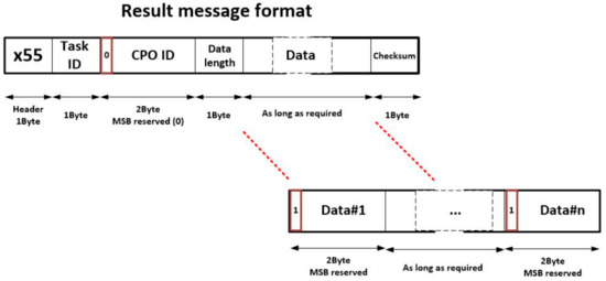 - Data (between zero and 512 bytes, as needed). In this field, all output data of the CPO are represented. Each data requires 2 bytes: the MSB is reserved (and initialized with a binary one) and the next 15 bits includes the particular value of the result. The order in which results are listed must be fixed and stablished for each operation.