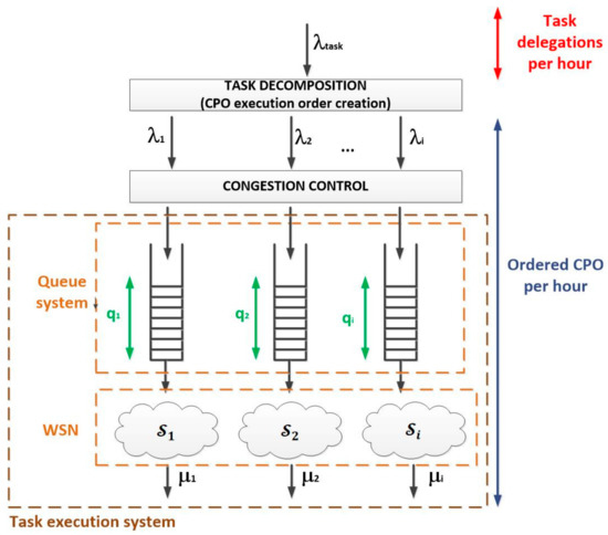 According to the Erlang’s queue theory, a lightweight gateway in the control middleware evaluates if the maximum allowed load in the sensor networks has been reached (i.e., if the network is congested). If positive, the task execution is rejected. However, in order to determine the maximum allowed load in the WSN, a statistical procedure is employed, so some rejected tasks are finally executed in order to determine if the network is in fact congested or the maximum allowed load can be increased.