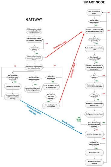 Once constructed, these orders are broadcasted in the WSN. Thus, the smart nodes in the WSN include a hardware module which, once received an execution order, decides if the node can or cannot execute this operation. In this decision, the proposed algorithm considers the available resources, the interest and importance of the operation to be executed and the predicted resource consumption made when performing the operation. These resource self-management functionalities are complemented with choreography solutions, so that nodes can decide in an autonomous way which device finally executes the operation (using pseudorandom number generators); and can also compose the final result of a delegated task from the partial results of the performed cyber-physical operations (using the identifiers and the cross-references included in the execution orders).
