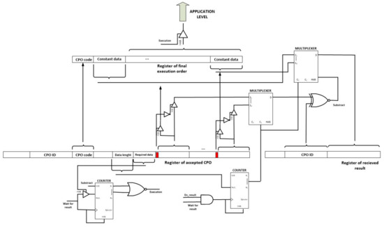 Using also tristate buffers and the one bit flag that is included with each data in the CPO execution order, it is decided if the corresponding data is a constant value that can be included directly in the final execution order, or a cross-reference that must be replaced. Each time a result message is received, two multiplexers are employed to compare the CPO ID to the pending cross-references and, if success, replace the adequate reference with the received results.