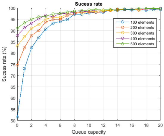 The third experiment was planned to evaluate the success rate in the execution of delegated tasks. The simulation scenario was the same of the two previous experiments but in this case, besides, workflows of CPO were randomly generated to be executed using the proposed solution. The success rate depending on the capacity of queues was evaluated. In this case, besides, it is interesting to repeat the experiment for different network configurations. Thus, the third experiment was repeated for a network including 100 sensors nodes, 200 sensor nodes, etc. The composition was always maintained as described in Table 1.