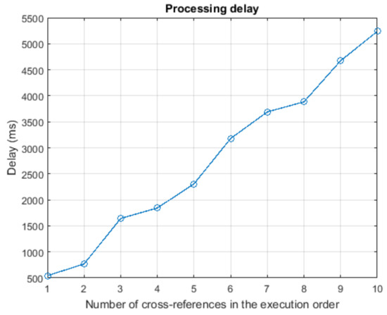 As can be seen in Figure 21, the processing delay grows linearly with the number of cross-references. In order to guarantee this result and to avoid the WSN congestion (when exponential laws appear), the lightweight gateway must maintain the utilization factor below the unit (as proposed in this paper). In general, the minimum processing delay is slightly above 500 ms (including all random timers). From Figure 21, besides, it can be deducted that a workflow including ten (10) CPO requires around 6 seconds to be executed using the proposed solution.