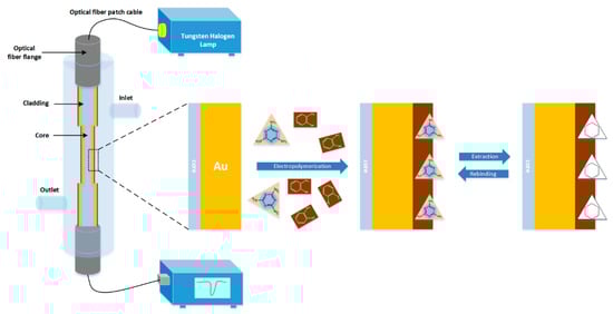Electrochemical polymerization for MIP probes was performed in a 70 mL volume self-made cylindrical electrolytic cell accommodating three electrodes, using the optical fiber probe coated with Cr/Au film as working electrode. A potassium chloride (KCl)-saturated Ag/AgCl electrode and a platinum plate electrode were used as reference and counter electrodes respectively. The optical fiber probe coated with Cr/Au was then dipped into the reaction solution and incubated for 30 min. The cylindrical electrolytic cell needed to be tightly closed and light blocking.