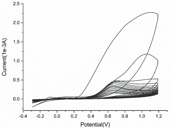 Cyclic voltammogram for the electropolymerization of MIP film on Au surface. Scan rate: 50 mV/s; number of scans: 30; potential range: −0.3 V to 1.2 V.