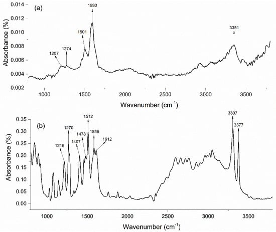 Since the MIP film on the surface of OF-SPR probe was synthesized by cyclic voltammetry (30 cycles) in the potential range from −0.3 V to 1.2 V under a scan rate of 50 mV/s, the MIP film was too thin to generate an infrared signal (data not shown). To characterize the surface groups on PoAP–MEL film, a thicker film sample was synthesized on the surface of a glass slide (1 cm × 1.5 cm) coated with Au film by cyclic voltammetry (150 cycles) in the potential range from −0.4 V to 1.3 V under a scan rate of 5 mV/s (Figure S1). Figure 3 shows the FTIR spectrum of (a) PoAP–MEL and (b) oAp. All the FTIR peaks assignment for PoAP–MEL and oAP were listed in Table 1. The typical peaks at 3377 and 3307 in Figure 3, represented the absorption bands of the asymmetrical and symmetrical N–H stretching vibrations.