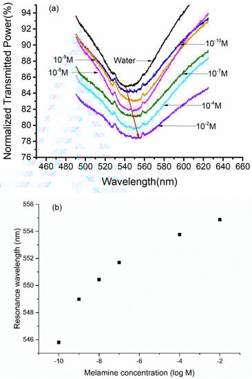 (a) SPR spectra for detection of melamine solution with concentration ranging from 0 M to M; (b) shift in resonance wavelength for the detection of melamine solution with concentration ranging from 0 M to M.