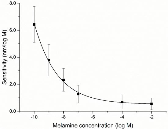 According to the definition of sensitivity under resonance wavelength modulation mode, which is the derivative of the resonance wavelength curve versus refractive index, we calculated the shift in resonance wavelength per unit change in the logarithmic scale of melamine concentration (nm/log M). From Figure 6, maximum sensitivity of the probe has been found to be 5.89 nm/log M at M melamine sample (the same probe in Figure 5). It decreased with the increase in melamine concentration due to the limited number of binding sites available in the sensing layer mentioned above. It was considered that the probes are more valuable for low concentrations of melamine. The error bar showed the maximum probable error in the measurement for 10 different probes.