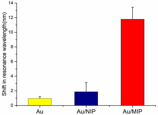 To confirm the recognition ability of PoAP–MEL film, resonance wavelength shift of Au/MIP probe was compared with probe covered with bare Au film probe and Au/NIP probe during the detection of melamine solutions with concentration from 0 M to M. All three probes were carefully made to ensure the sensing region and the Au film thickness equal. The comparison of observed shift in resonance wavelength was shown in the histogram (Figure 7). A small shift of 0.95 nm in resonance wavelength was observed for bare Au coated probe since melamine solution concentration from 0 M to M varies little in refractive index. A shift of 1.87 nm in resonance wavelength was observed for Au/NIP coated probe due to barely any binding sites on NIP films. In the case of Au/MIP probe, a remarkable shift of 11.79 nm was observed for the same concentration change of melamine solution. This suggested it is the cavities formed by templates trapped during the polymerization rather than poly(o–aminophenol) that had the ability to absorb template molecule.