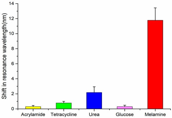 Specificity is the fundamental feature of a MIP sensor. In this study, acrylamide, tetracycline, urea, glucose and melamine were chosen to verify the specificity of PoAP–MEL film. Figure 8 shows the comparison of resonance wavelength shift for the change in concentration of analytes from 0 M to M. Compared to other analytes, the observed shift in resonance wavelength reached over 11 nm, which showed a very high specificity for melamine. Meanwhile for acrylamide, tetracycline, urea, glucose they were 0.31 nm, 0.78 nm, 2.18 nm and 0.31 nm respectively. Removal of templates from MIP film exposed cavities with complementary size and shape related to the templates for the subsequent rebinding process, which formed a “lock and key” relationship [62]. Thus, only template molecules could enter these binding sites, while other molecules were unable to form a mass accumulation on the surface of MIP film, which resulted in limited change in dielectric index at the gold layer–MIP interface. Therefore, only little shift in resonance wavelength for other analytes was observed.