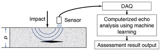 A typical computerized hammer sounding interpretation system consists of two parts, the hardware and data analysis computing system [6,7]. Impact on the surface produces P- and S-waves that travel into the target structure. Then the responses are captured by a transducer nearby, i.e., an air-coupled microphone. Through data acquisition (DAQ) process, the data is analyzed by a program, and the condition assessment result is presented. Figure 1 shows the schematic flow. This paper mainly addresses the issue of devising an efficient machine learning algorithm for hammer sounding data investigation.
