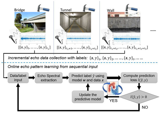 We introduce the details of the proposed online machine learning-enabled hammering response analysis system in this section. The processing flow has been shown in Figure 3. We assume that the responses have been received in a streaming way and all the data had been annotated by a professional inspector with healthy or anomalous labels. Notably, during the data collection, the material, shape, and other specifications of target structures can vary from place to place. For instance, in Figure 3 the inspection place shifted from bridge to tunnel, meanwhile the captured data/label indexes range varied from to , respectively. Our goal is to continuously update the analysis model so as to achieve near-human performance for flaw-induced hammering response identification. To this end, it is crucial to devise the efficient online learning scheme and various state-of-the-art algorithms have been reviewed and compared. The details are presented as follows.
