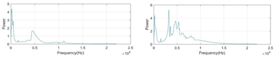 where is waveform of hammering response to be analyzed and is the extracted spectrum. In the following contents, we will use to denote the spectrum collected at time stamp t, with d frequency-bins. Our pattern classification process is based on Fourier spectrum representation of response signal. In Figure 4, we present two spectrum examples, which were collected from normal and defective concrete structures, respectively. According to the plots, differences in spectral distributions can be clearly observed. In addition, at a low frequency region below 500 Hz, high noise power can be seen which is irrelevant to the specimen. We employed high pass filter to eliminate the ambient noises presented in the band lower than 500 Hz. Meanwhile, to reduce feature dimension, we also discarded the frequency bands higher than 15 kHz, since there existed no discriminant information.