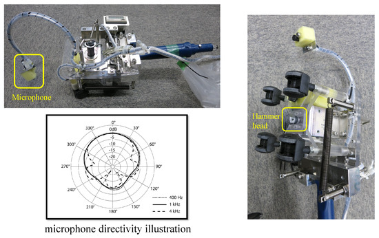 The hammer device and microphone used for data capture (upper, right) and the microphone directivity illustration.