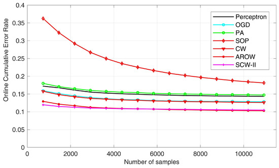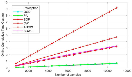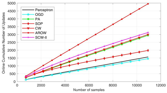 As for the second evaluation criteria—computation efficiency, we presented the cumulative time costs for all the seven online learning algorithms under evaluation in Figure 9. We found that the first-order schemes exhibited superior efficiency due to their simpler formulation. The SOP method took the longest time in process, which is one of initial second order approaches. Confident-weighted learning methods, including both CW and SCW, achieved favorable performance in balancing accuracy and efficiency. To demonstrate the complexity of online learning algorithms, we further showed cumulative number of updates. In general, fewer update steps indicates the algorithm is efficient in establishing a more robust pattern classification hyperplane such that input feature distribution shift can be accommodated. By examining Figure 10, we can see that first order methods usually produced smaller numbers of updates. However, the classification accuracies were inferior. AROW scheme made significantly larger number of updates, which can induce high time cost in processing.