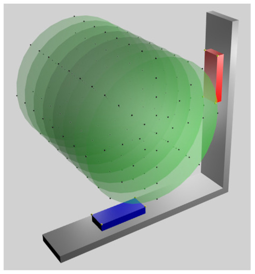 However, the previous matrices just considered the external spatial displacement between LEAPs and not “logical” transformations due to internal differences between LEAPs and between each of their reference systems with respect to the mill reference system. To include these effects into the previous matrices, a series of spatial measurements with the horizontal LEAP were collected and then repeated on the same points with the vertical LEAP mounted in the horizontal box. In this way, effects of matrix transformation were excluded and differences were just due to internal constructive discrepancies between sensors. A total of 264 measurements (Figure 2) were collected on the surface of concentric cylinders (radii equal to: 0 cm, 2.5 cm, 5 cm, 7.5 cm and 10 cm; sampling angles: 0, 45, 90, 135, 180, 225, 270, and 315) with the axis oriented along the z-axis of the LEAPs (along z, a total of 8 slices, 3 cm apart, were measured around the centre of the VG system for a total length of 21 cm). In addition, these data were analysed through SVD to find the resulting transformation matrices, one for each LEAP. The transformation between the coordinate system of each LEAP was obtained and the mill coordinate system was simply an axis translation (no distortions or scaling factors occurred and just negligible fluctuations, due to measurement noise, to the upper left region of the matrix were present). The obtained translation matrices were added to transformation matrices in Equations (1) and (2) (before adding the contribution obtained for the vertical LEAP, it was first converted by using the inverse of matrix in Equation (2)) to obtain the final modified transformation matrices for the horizontal and vertical sensors, respectively: