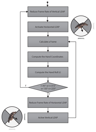 One of the major issues was the simultaneous management of multiple instances of the LEAP since two sensors cannot be driven simultaneously by the same machine. This was solved using a virtual machine. The virtual machine (Slave) was installed on the physical machine (Master). One sensor was assigned to Master and the other to Slave, thus allowing each machine the instantiation of its own, single, driver. Data provided by both machines were rerouted towards a server (hosted on Master) to send data of both devices to clients running on Master. The hand tracking strategy for the proposed VG was based on mutual exclusion. The algorithm used for data acquisition, illustrated in Figure 3, was based on a control switching approach: both LEAPs acquired their own data stream, but only one sensor, depending on the rotation of the hand with respect to the horizontal LEAP reference system, was used to represent the hand and selected as “active” (the algorithm used for hand representation was that used internally by the LEAP). The palm vector v, perpendicular to the palm and provided by the sensor software, was used for computing the roll r of the hand, that is the angle between the x axis and the projection of the vector on the x–y plane, with respect to the horizontal LEAP reference system. If r was inside the interval 225–315 (the palm was facing downwards) or inside 45–135 (the palm was directed upwards), the horizontal LEAP was selected as “active” and the frame rate of the vertical sensor was reduced for saving computational resources), and vice-versa for the other LEAP. When vertical sensor was active, the server provided its coordinate change to the horizontal LEAP reference system. The server was also responsible of checking for the active LEAP, sending data to the client and, if needed, switching the status of the sensors. For using information from both sensors, their reciprocal position had to be computed with high accuracy through calibration.