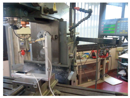 The mill equipped with the three axes movement system. The stick (a) was fixed to the static structure of the mill also hosting the mill tool (b). The VG structure (c) was secured by a grip to the three axes moving block of the mill (d), controlled numerically. The stick was used both to measure the LEAPs position with respect to the mill reference system and to collect spatial measurements inside the ROI.