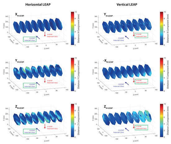 Distance between points measured by the mill positioning system and by each of the LEAPs along different axes after calibration. Since measurements were referred to the mill axes, the original LEAP axes were reported inside the graphs to allow a direct comparison between corresponding axes of both sensors. The position of the internal x axis of each LEAP was also reported. The green box indicated the “active” LEAP.