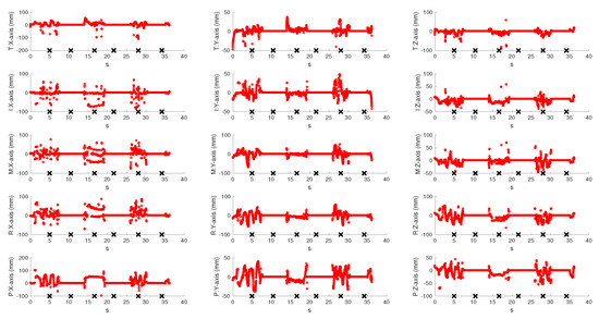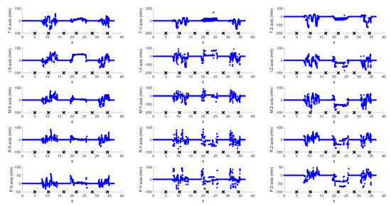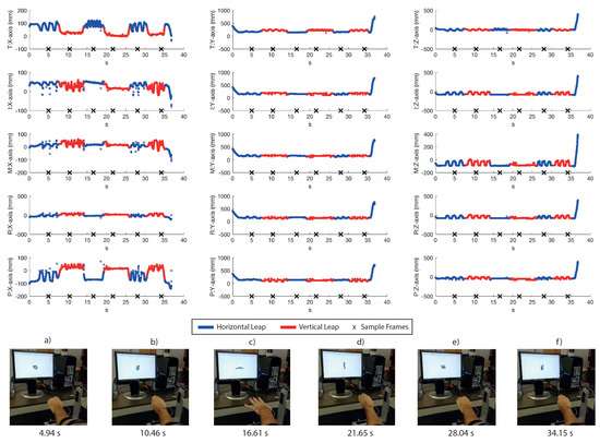 To evaluate the real-time behaviour of the VG system, a left hand tracking sequence of 37 s, recording continuous palm rotations and fingers movements, was collected. It is important to note that we could have also performed a right hand tracking without any modification of the system: the only requirement would have been the insertion of the hand from the other side of the VG in order to ensure the view of the palm of the hand to both sensors. In fact, VG is completely independent of the hand inserted into it (left/right) and of its shape or size (this means that hands of different persons could be tracked by VG without any modification). The palm remained still for about 5 s and then performed fast rotations of 90, with the first orientation parallel to the horizontal LEAP. Fingers were continuously moved and some positions were chosen to produce occlusions for at least one of the LEAPs. For example, fingers were moved back and forth on the palm plane by using the abduction/adduction movements of the first joint (e.g., spreading fingers apart), flexed to form fist, or completely extended. The resulting coordinates of all joints and of the palm were recorded for both LEAPs and for the VG system. Figure 7 shows the coordinates of the fingertips measured by the VG at 60 fps (to avoid confusion, just fingertips were shown, though all joints were tracked). Measurements collected with H-LEAP are indicated in blue and those collected with V-LEAP are in red. An external video (provided in the Supplementary Materials), synchronized with the acquisition/tracking process, was also collected to show how the hand was moving, to capture simultaneously the hand movements and model reconstruction/representation on a computer screen, to verify the fluidity of the movements and the absence of discontinuities when VG switched from one sensor to the other. Some snapshots of the video, presented in the lower part of Figure 7a–f, correspond to the crosses reported on the time axis, in particular: images in Figure 7a,b were collected while the hand was repeatedly open and closed by using all fingers, though along perpendicular directions; in Figure 7c,d, the hand was open and fingers were continuously abducted/adducted, but along perpendicular directions; Figure 7e,f repeated Figure 7a,b, respectively, to demonstrate measurement repeatability. Tails of the recorded hand movements reported in Figure 7 registered the phases of insertion and removal of the hand inside the VG. Measurements contained occlusions: for example, in Figure 7a, all the tips, except thumb and index, were occluded to V-LEAP and, in Figure 7d, all the tips were occluded to H-LEAP. In these cases, VG used measurements from one LEAP by excluding the other in a switching way. Figure 7, supported by the external video, also shows that, though switching from one LEAP to the other, the fluidity of the movements of the hand model represented on the computer screen was maintained without discontinuities, thus demonstrating the good accuracy of VG calibration. Moreover, the resulting VG frame rate, 60 fpm, demonstrated the maintenance of an optimal computational performance (each LEAP, separately, could be driven at 100 fpm), since for hand tracking rehabilitation purposes 20–25 fpm would be sufficient [25]. Figure 8 and Figure 9 reported the differences between the collected VG signals and those collected by each LEAP: obviously, differences were zero when VG used the signal corresponding to the active LEAP; some values were very high; and, due to occlusions, some values were highly spurious (high-frequency oscillations occurred). When a LEAP is unable to really “see” a point, in the case of occlusions, it tends to estimate its location, which can result very far from the real one. Moreover, the resulting estimated location can change rapidly with time as new frames arrived. Data from Figure 7, Figure 8 and Figure 9 are very useful to calculate the number of unmatched data (outliers) between the VG and each of the LEAP sensors.